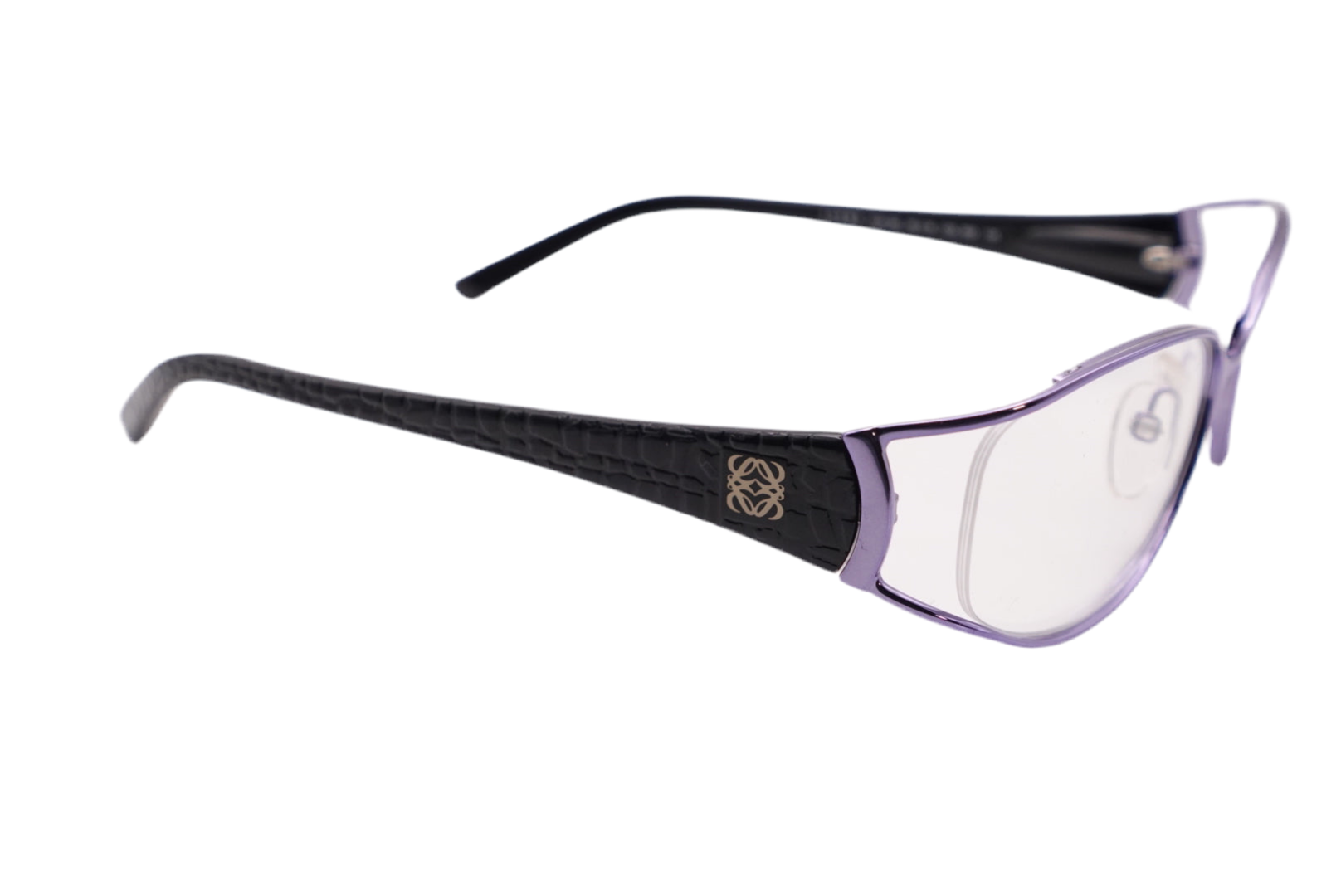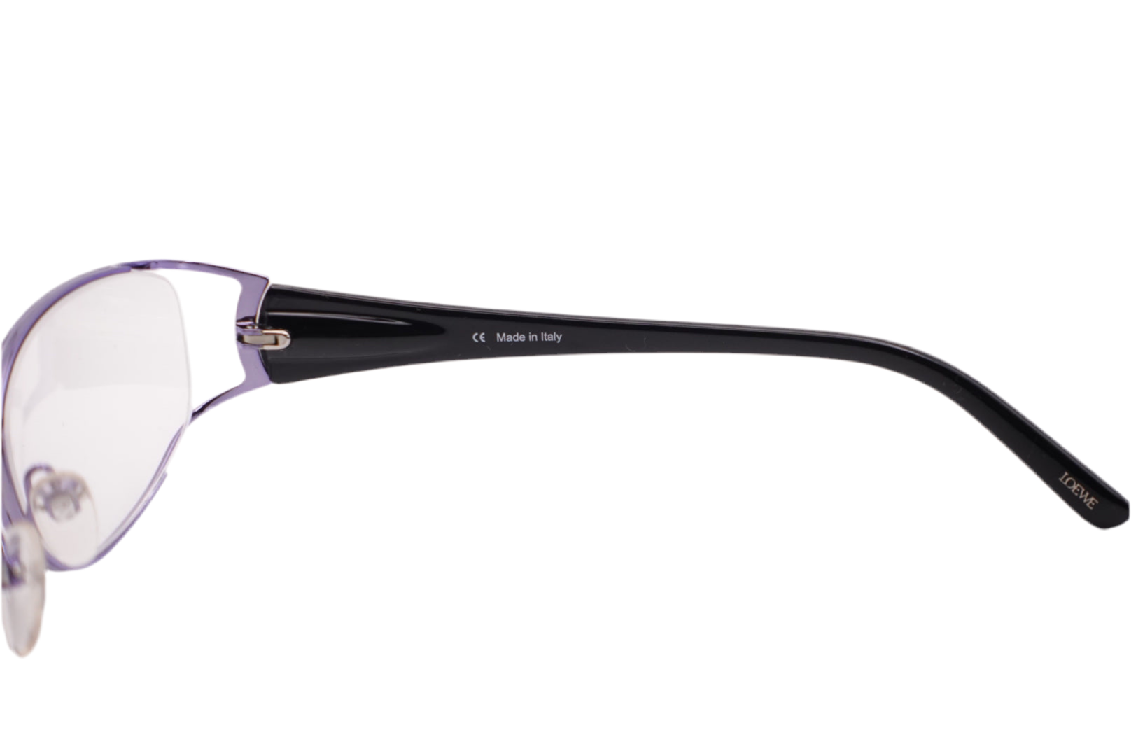 Here we have these Y2K Loewe VLW 192 frames, a rare mini oversized design crafted in the early 2000s, finished in a purple chrome and black croc skin style finish.
