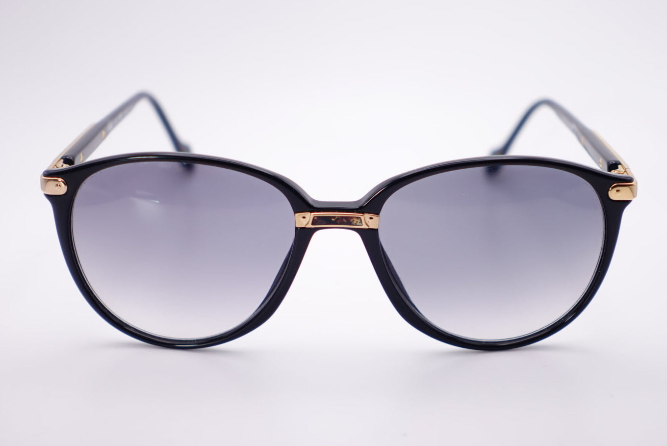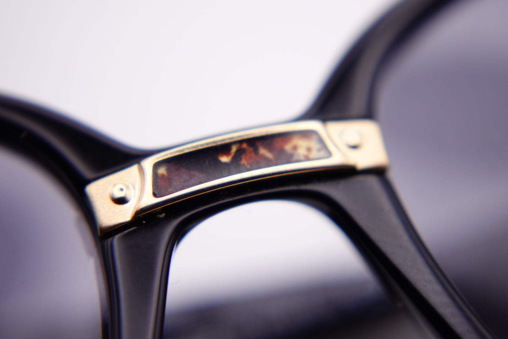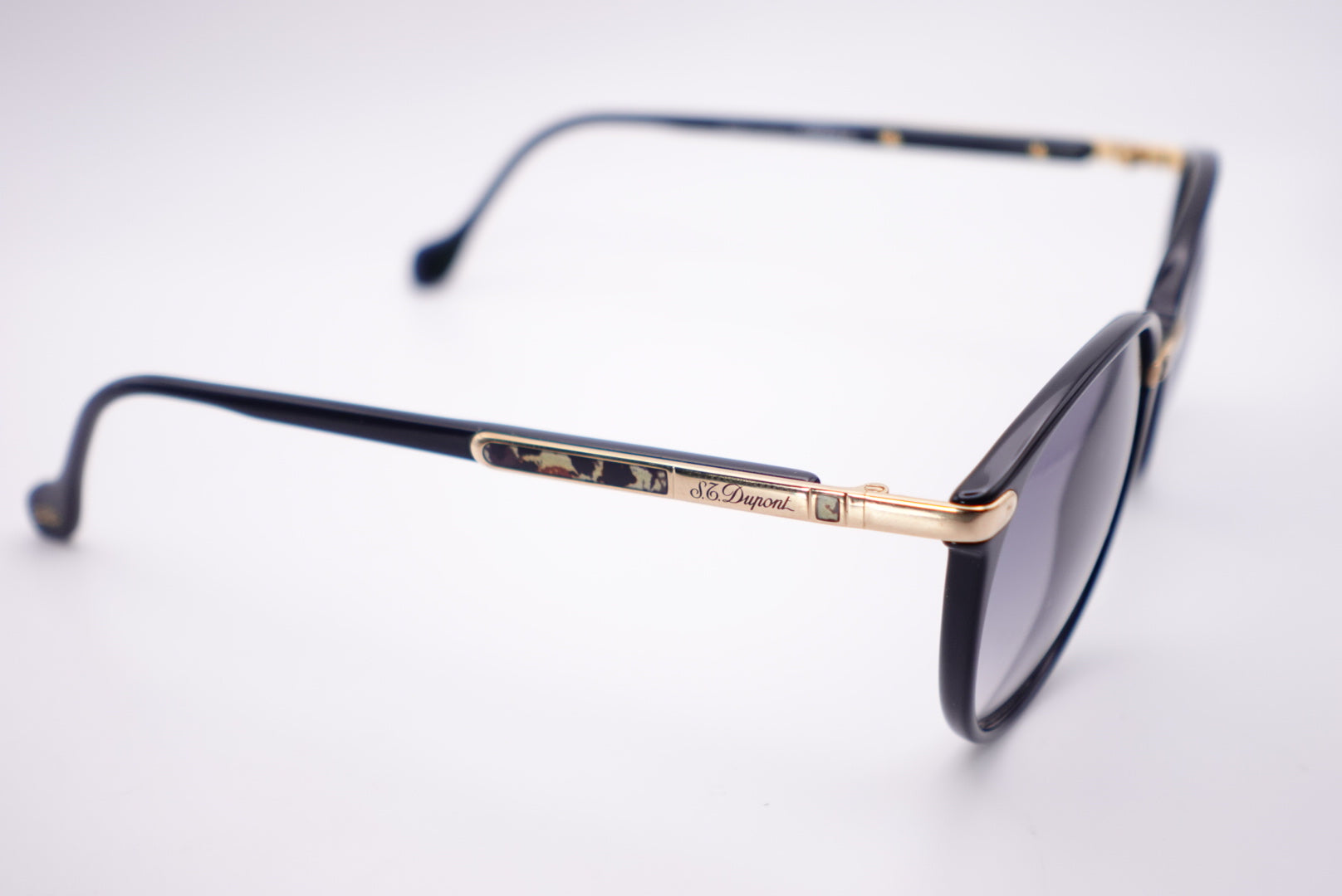 Original 1980s S.T. Dupont MD 003 20 frame featuring a black finish with gold hardware and intricate marbled enamel detailing in rich red, brown, and grey tones. Beautifully crafted with fine detailing throughout, paired with elegant grey gradient lenses. A refined and luxurious vintage piece with timeless appeal.
